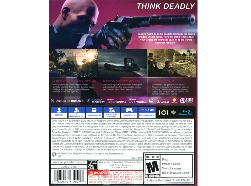 | About this item | - Travel the globe and track your targets across exotic sandbox locations in HITMAN 2. From sun-drenched streets to dark and dangerous rainforests, nowhere is safe from the world's most deadly assassin, Agent 47. Prepare to experience the ultimate spy thriller story - your mission is to eliminate the elusive Shadow Client and unravel his militia, but upon learning your target's true identity and the truth about 47's past, nothing will ever be the same