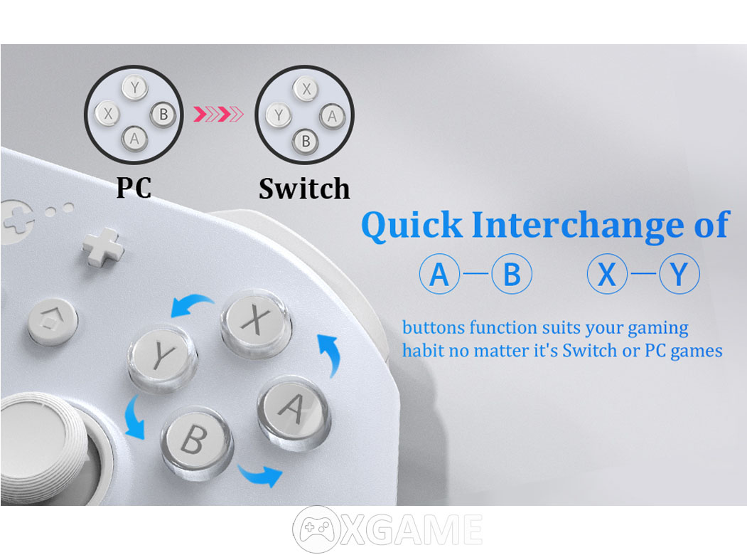 Các nút chức năng của tay cầm tương ứng với tay cầm Pro Controller chính hãng Nintendo, con quay hồi chuyển 6 trục và rung, chế độ HD rumble, IR, or Amiibo NFC